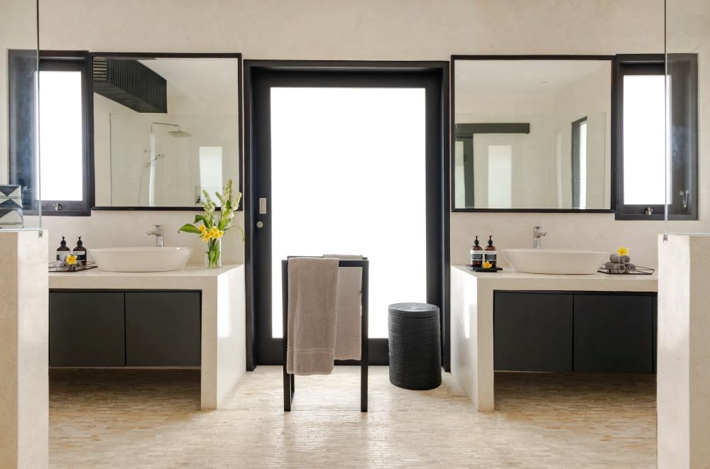 The same monochrome palette continues through each ensuite bedroom which feature king-sized beds, highquality linens and quality amenities, ensuring comfort and privacy for every guest -an essential consideration when travelling with extended family or a large group of friends. A fully equipped gym is available for those who wish to keep up their routine, while The Luxe Nomad team can assist with arranging in-villa massage treatments, activities and personalised experiences, allowing every stay to be shaped around the group.