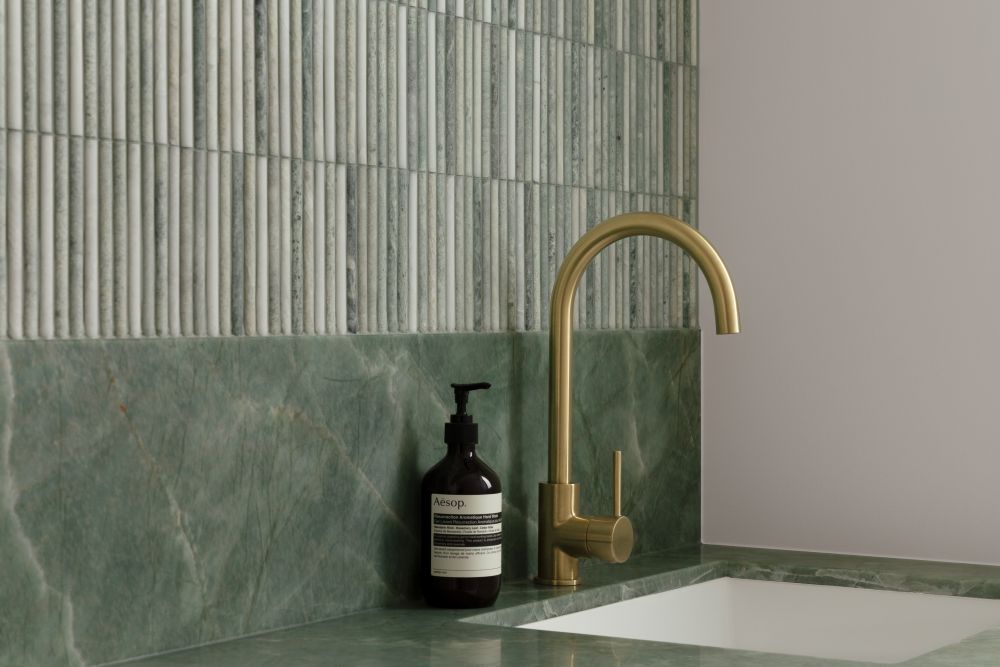Grange Haus shows how restrained interiors can still feel luxurious. By pairing subdued, natural tones with the richness of Brazilian emerald quartzite and the warmth of ABI Interiors’ brushed brass Elysian tapware, the home achieves a refined, understated sense of luxury that feels balanced, deliberate and enduring.