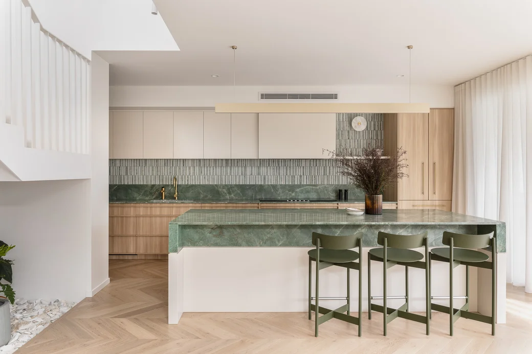 Grange Haus shows how restrained interiors can still feel luxurious. By pairing subdued, natural tones with the richness of Brazilian emerald quartzite and the warmth of ABI Interiors’ brushed brass Elysian tapware, the home achieves a refined, understated sense of luxury that feels balanced, deliberate and enduring.