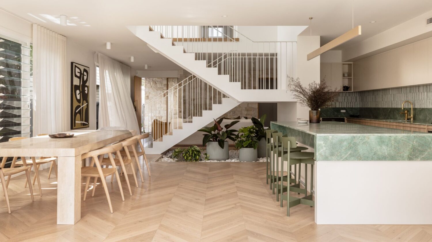 Referencing the materiality of the exterior, Australian riverstone is brought inside as a feature wall, while bifold windows strengthen the connection between indoors and out, allowing garden greenery to become part of the interior backdrop. A sculptural staircase sits between the kitchen and living zones, acting as a subtle divider while still allowing natural light to move freely through the space.