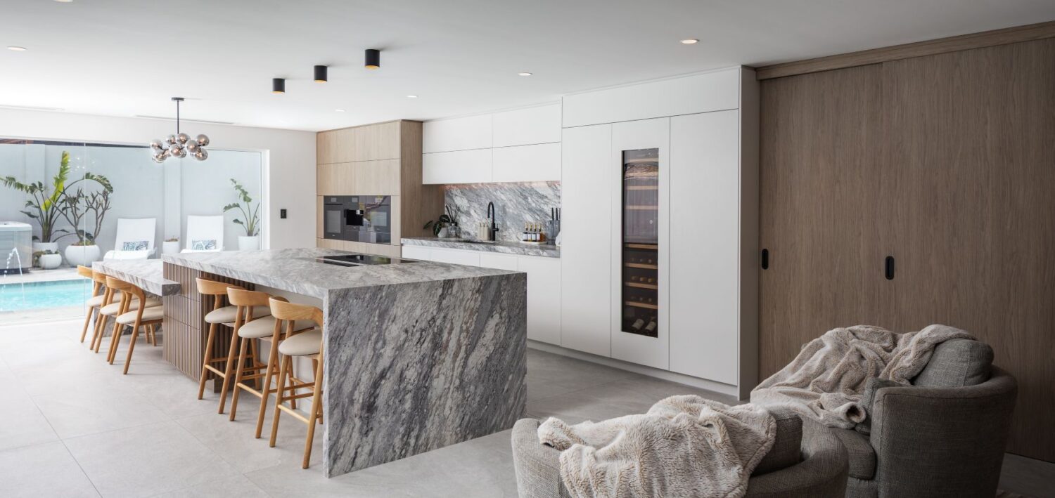 The result is a harmonious blend of functionality and sophistication: a calming two-tone cabinetry palette anchored by striking granite surfaces, complemented by timber accents for a relaxed yet refined feel. Smart features such as electric overhead cabinets, integrated refrigeration, slimline sliding pantry doors, and a concealed study nook keep everyday clutter out of sight. Finishing touches—glasslined shelving, feature lighting, and an integrated wine fridge—add understated luxury without overwhelming the space.