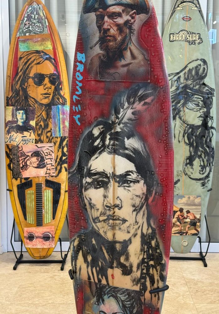 So instead, I make boards. Restore them. Reinvent them. Decorate them. Patch them. Glass them. I get to stay connected to surfing through the boards themselves. Strangely enough, I do a huge amount of this work in my swimming pool. After stripping wax and scrubbing away years of grime, sometimes collected from backyards, under houses, or half buried in the bush, I clean them with scrapers, steel wool, wet-and-dry sandpaper, and sometimes a stop at the car wash. Then I patch, tape, collage, carve into them, drop signwriting and quotes into them.