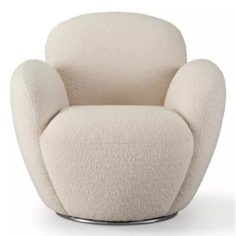 A more compact version of the lounge model, the ASTREA armchair pairs Orsetto Flex fabric with a glossy chrome swivel base (W75 × H68 × D80 cm).