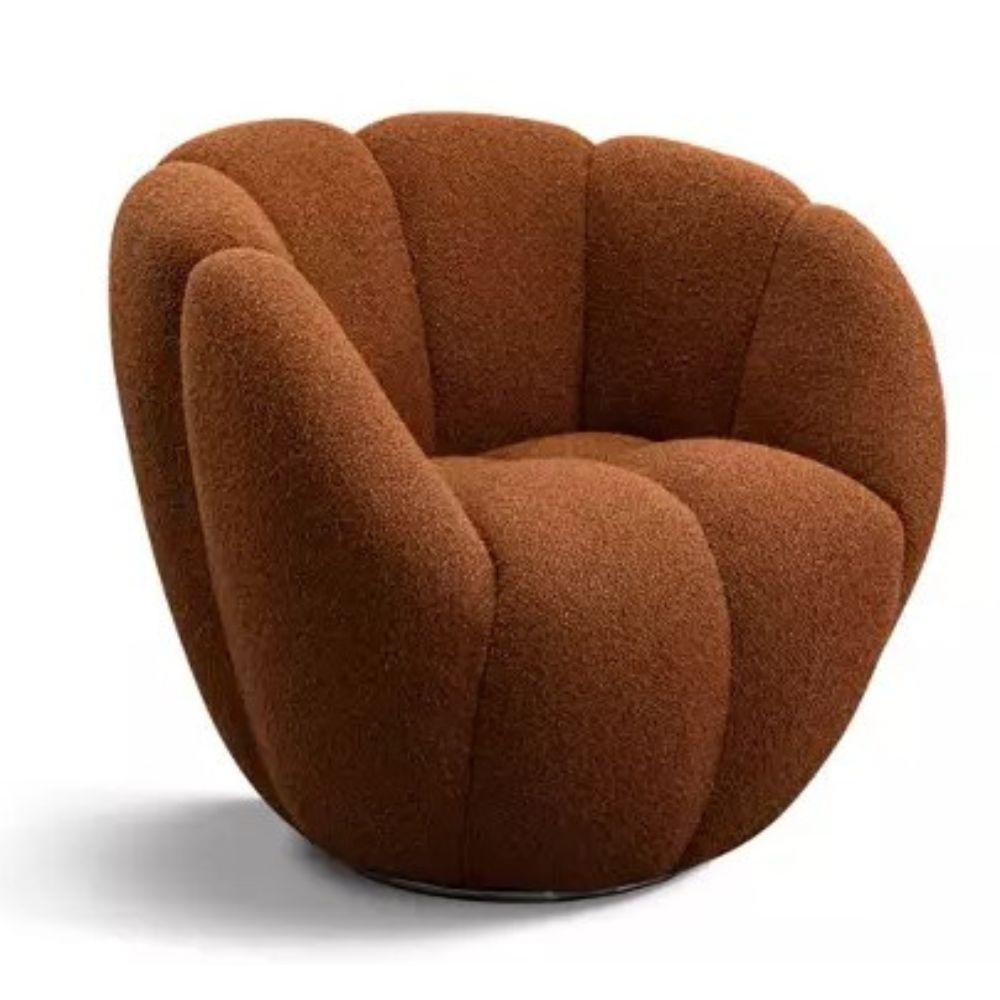 A sculptural form upholstered in Ricochet fabric, the PÉTALE armchair includes a glossy chrome swivel base with automatic return and memory position (W76 × H72 × D81 cm).