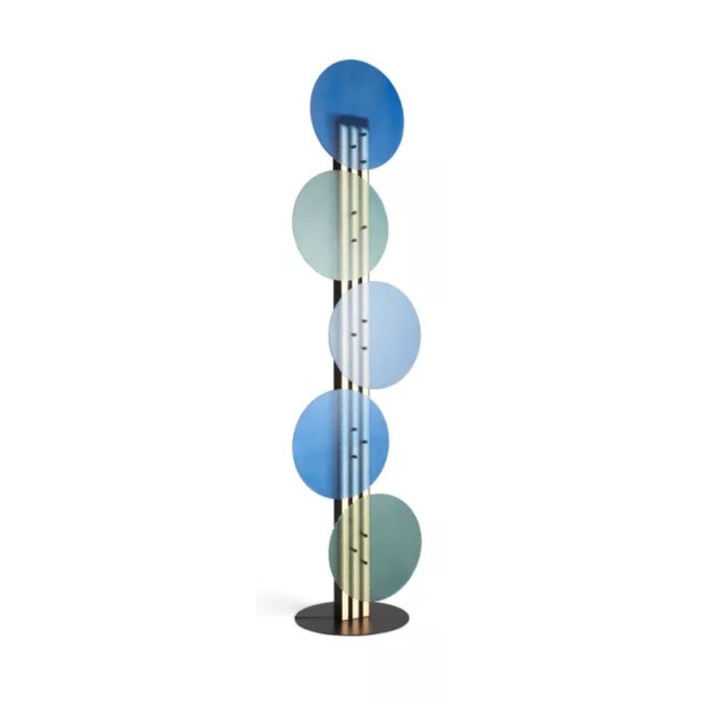 A signature design for this season’s edit, the CONFETTIS lamp stacks coloured glass disks on an aluminium frame, creating a joyful interplay of colour (W55 × H207 × D43 cm).