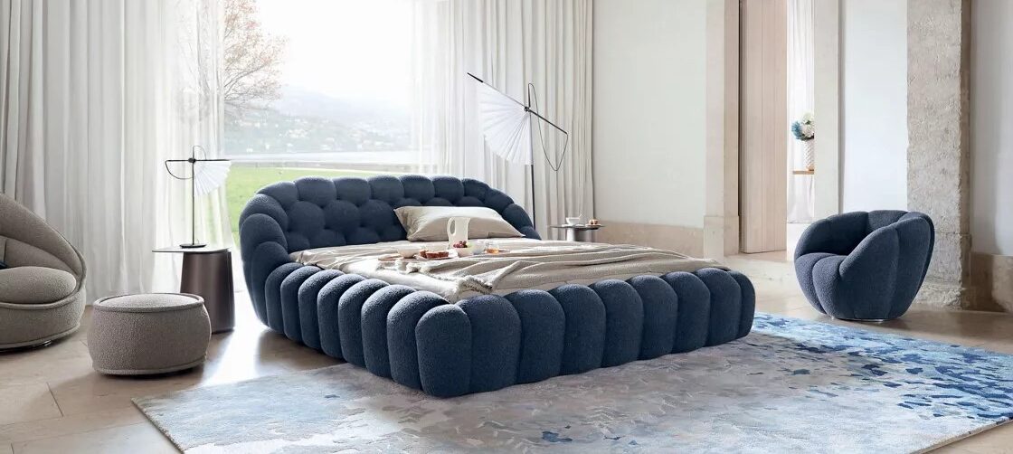 Upholstered in Passion fabric and fully tufted, the iconic BUBBLE ottoman brings softness and sculpture together in a playful, cloud-like form.