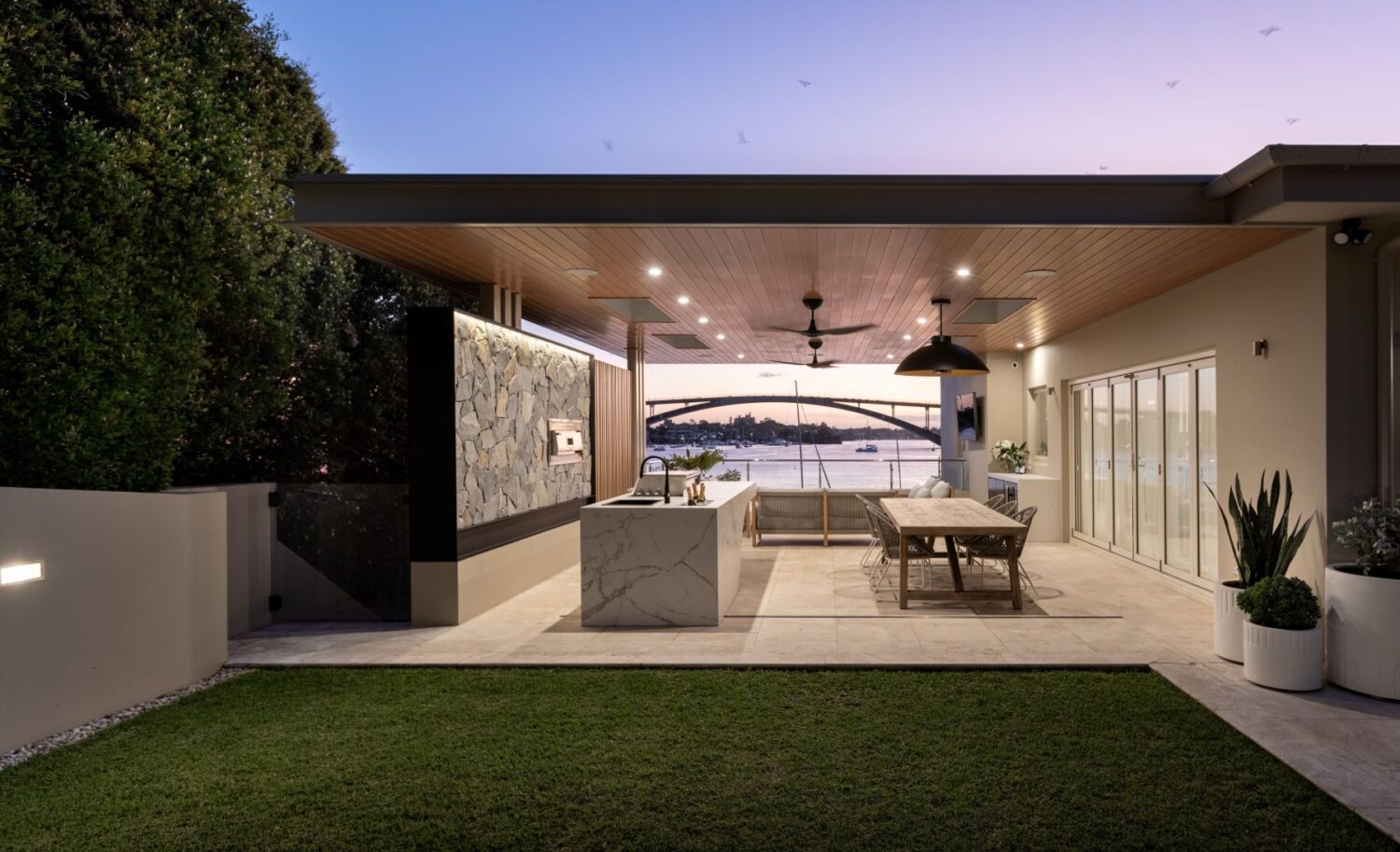 What was once an underutilised paved area is now a striking entertaining pavilion, expertly designed for year round enjoyment. The inspired island bench which appears to float at one end, echoes the arch of the nearby Gladesville Bridge which is visible across the water. This sculptural centrepiece anchors the space and is fully equipped with a sink, BBQ and built-in ice bucket, setting the tone for sophisticated outdoor entertaining.