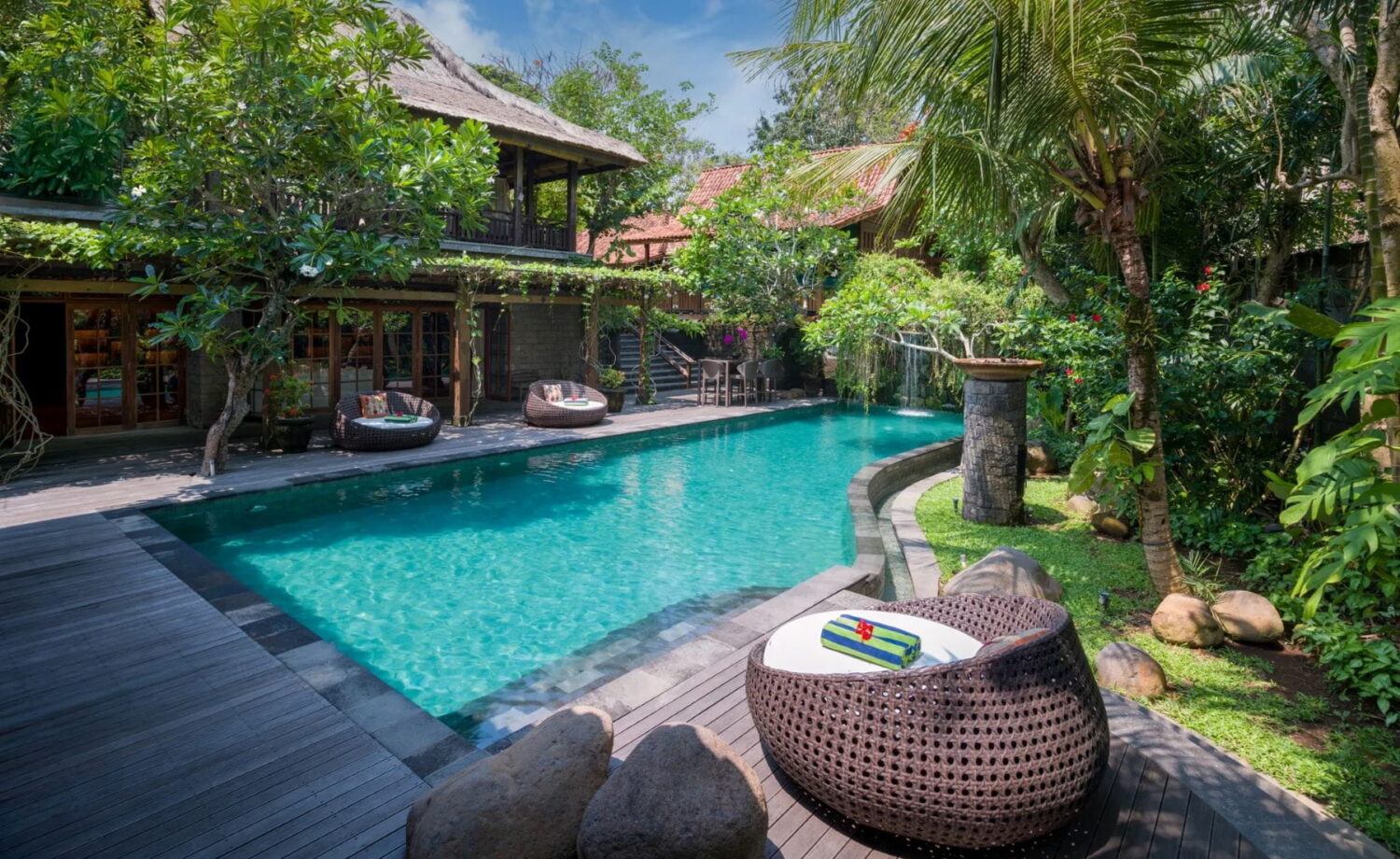 The grounds are designed as a serene water garden, layered with ponds, carved stone statues, frangipani trees and tropical planting. At the heart of the estate sits a striking waterfall-fed 15 metre swimming pool, framed by stone terraces, circular daybeds and shaded pavilions. It’s a setting made for unhurried days – swimming, reading poolside, or gathering together as the light softens towards evening.