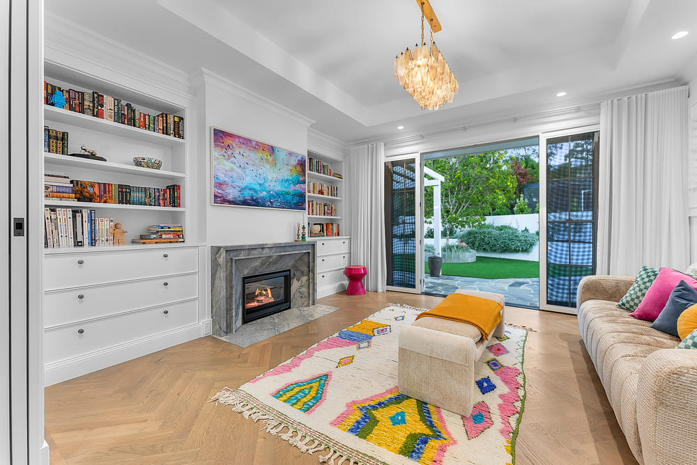Inside, the craftsmanship becomes even more apparent. The living space is light-filled and generous, anchored by a beautifully detailed fireplace that acts as a focal point without overwhelming the room. Clean joinery lines, custom cabinetry, and integrated storage demonstrate careful planning and a high level of execution. The ceiling treatment, with exposed white beams run across both living area and adjoining patio, creating a unified visual rhythm and reinforcing the home’s open concept design. Large sliding doors span the width of the room transforming the two areas into a continuous living zone, emphasizing airflow, natural light and an easy transition to the surrounding landscape. The subtle lighting adds warmth and architectural interest while showcasing meticulous attention to detail. Every surface—from the smooth plasterwork to the finely finished French Oak timber floors—speaks to precision and care.