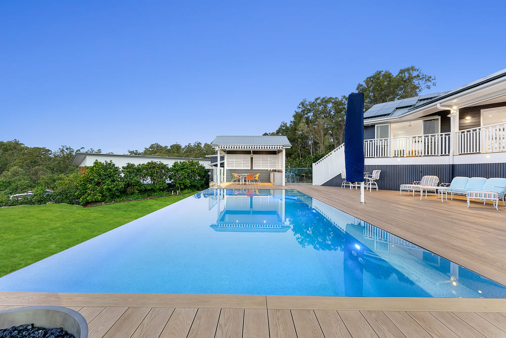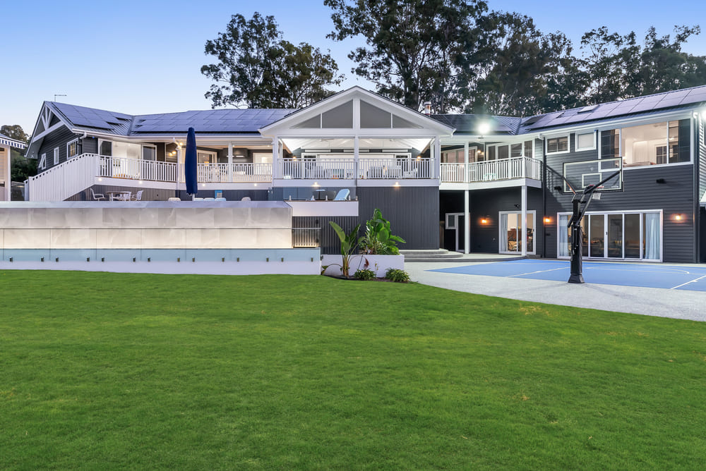 This modern coastal farmhouse makes entertaining outdoors a luxurious resort experience with multiple outdoor areas around the home. The upper decks’s alfresco and BBQ are supported by three distinct zones, casual seating for keeping the cook company, a dedicated dining area, and a relaxed lounge, all positioned to overlook the sleek infinity edge pool visually merging with the beautiful surrounding landscape. The pool sits on an elevated terrace bordered by clean architectural lines and timber deck that extends the homes living space outward. A pool pavilion offers a sheltered vantage point that frames the pool, an additional alfresco kitchen within the pavilion for convenience. Adjacent to the residence is a purpose built pad dedicated to a basketball. Its placement maximises open space while maintaining clear sight-lines back to the homes multiple balconies reinforcing the sense of connection between indoor and outdoor living. A private yet versatile space designed for active living without compromising the home’s reined architectural character.