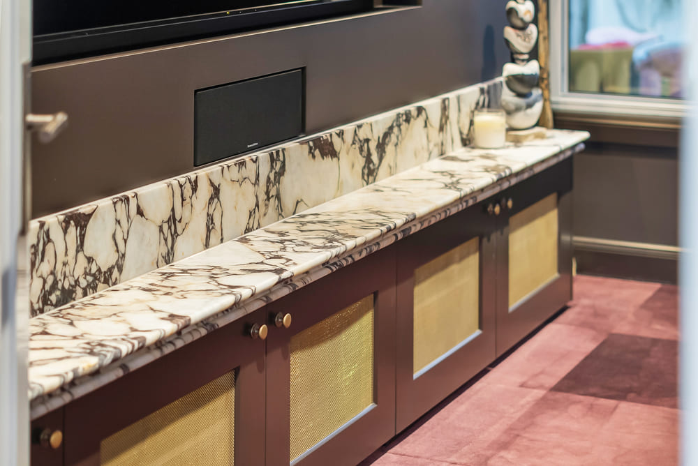 A dedicated media lounge offers a more immersive retreat, beautiful framed panelling give the room a cinematic feel which the recessed ceiling with integrated lighting and speakers, stunning built in cabinetry keeps the room clear to concentrate on quality viewing.